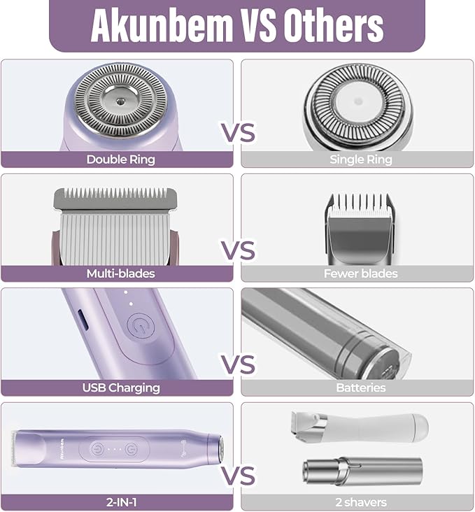 • Versatile Grooming Kit: Akunbem women electric shaver features an innovative dual head design that combines the functions of a body and facial shaver in one. There is no need to change the cutter head frequently. It can accurately and smoothly remove hair from the face, body and sensitive areas.