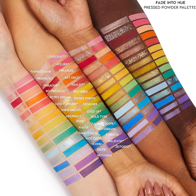 • Fade Into Hue - We finally did it, our rainbow mega palette is here! This fantasyland of abstract colours features a mixture of sparkling Metallics, blinged-out Pressed Glitters, and the richest Mattes that apply evenly and blend like a dream. One palette can really do it all.