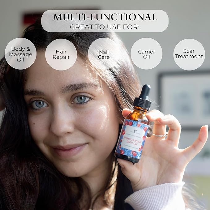 • Ideal for Hair: Our Pomegranate Oil for skin and hair is a natural powerhouse that revitalizes and adds a brilliant shine to your hair. Use it as a scalp treatment to nourish from the root or apply a few drops to split ends to help prevent and repair breakage.