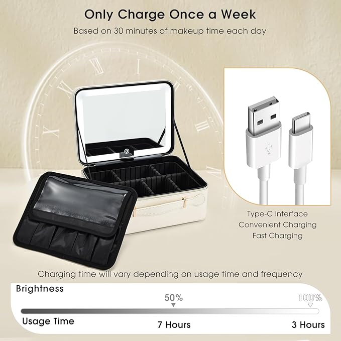 - 【ONLY CHARGE ONCE A WEEK 】- The LED mirror is equipped with a built-in 2000mAh battery, alleviating concerns about battery life during use. Based on an average daily makeup time of 30 minutes, it typically requires charging only once a week. It is important to note that charging duration may vary depending on usage time and frequency.