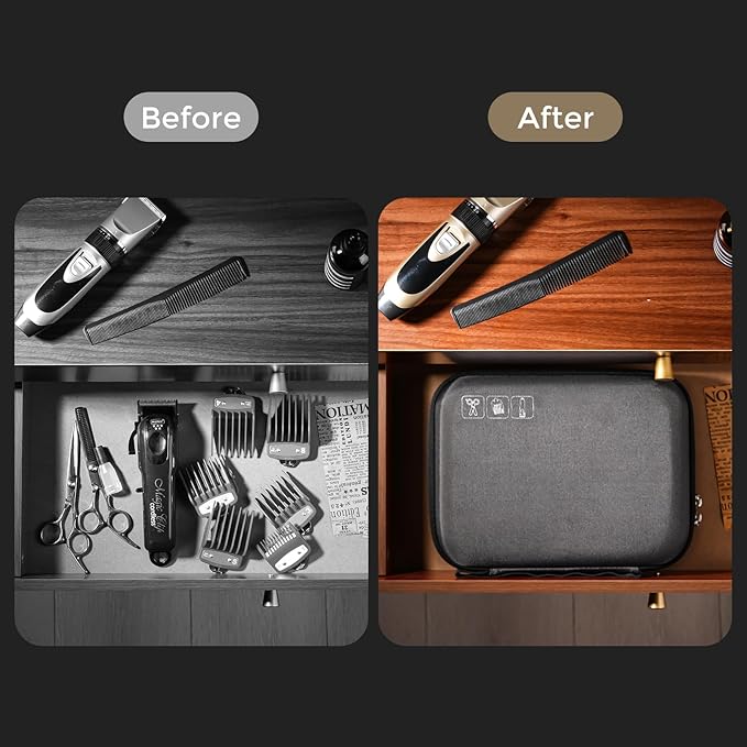 • Dimensions: 10.24*7.48*3.54 inches. Compatible with TPOB/Hatteker/Brightup/ Andis/ Oster/ EHJYO/ Suttik/ Karrte and most hair clippers and its scissors, combs, charging cables, and other accessories