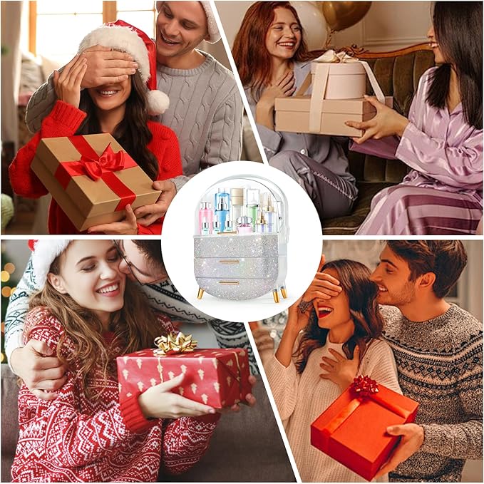• [Large Capacity]:Large top open clear compartment is able to store about 12 tall bottles and the bottom 2 drawers are ideal to store your lipsticks,eye shadow,brushes,jewelry and other little pieces.